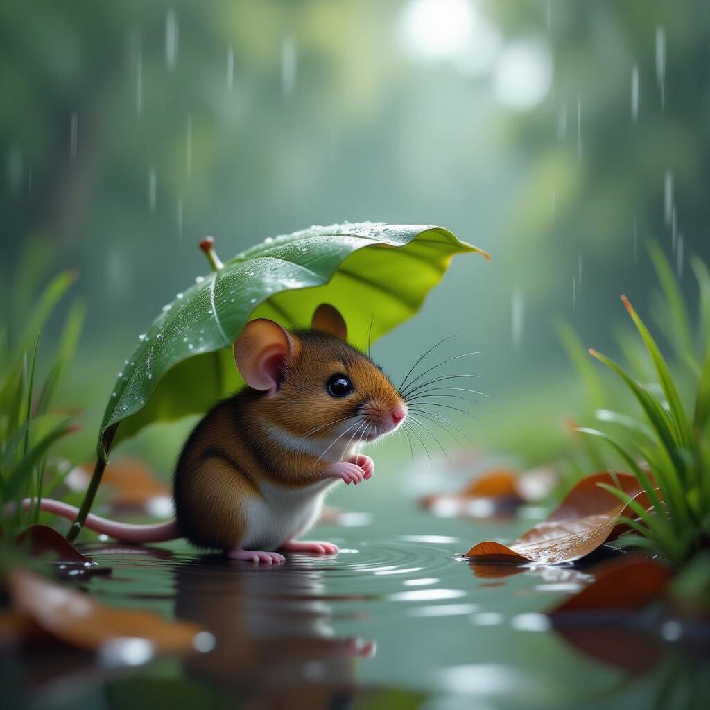 This CG render shows a mouse finding refuge under a leaf during a downpour. The artwork features intricate details and vibrant colors, reminiscent of Renaissance painting, with a high-resolution, immersive quality.