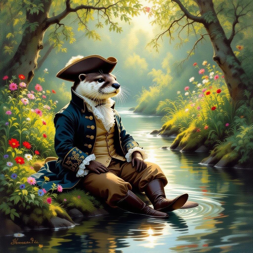 This image shows a serene otter in elaborate 17th-century attire, set amidst a lush forest scene with vibrant wildflowers and a gentle stream, captured in soft, Impressionist-style brushstrokes and warm, natural colors.