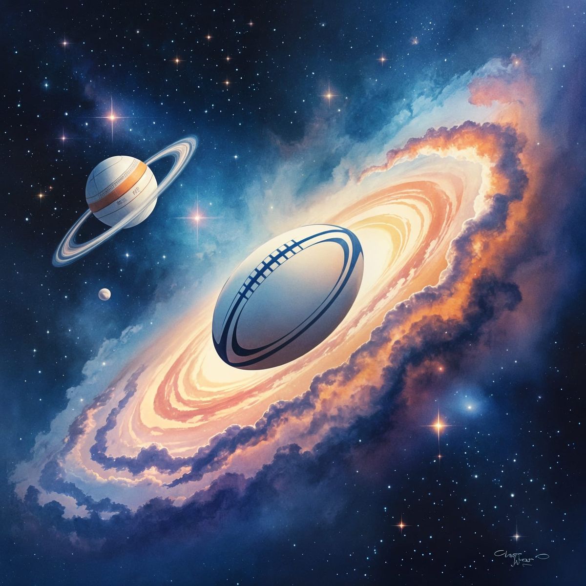 This image shows a solitary rugby ball floating in space, amidst swirling nebulae and distant stars. Rendered in soft watercolor washes with gentle gradients and ethereal colors.