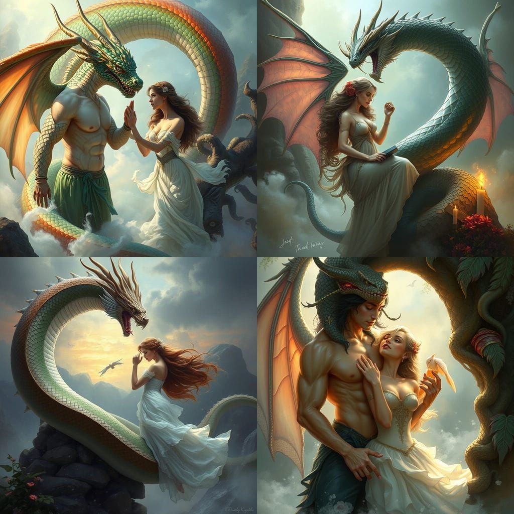This enchanting image depicts a mystical being with a serpent's lower body, charming a human woman in a dreamlike atmosphere, reminiscent of Thomas Kinkade's style with intricate details and misty ambiance.