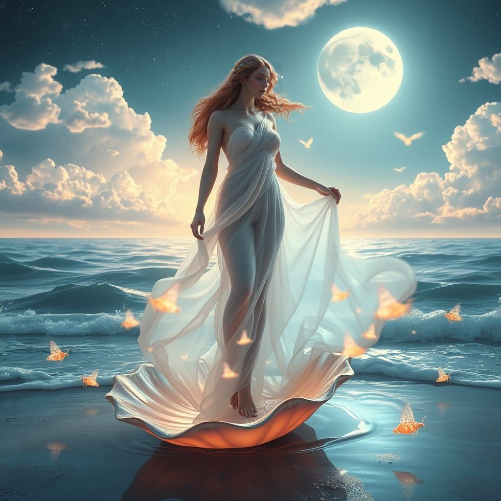 "futuristic style A romantic night by the sea, inspired by Botticelli’s Birth of Venus. The goddess Aphrodite is stepping out of the moonlit waves onto the shore, standing on a seashell at the edge of the water, near the shoreline. She wears a flowing translucent veil. Around her, tiny glowing fairies and flying fish swirl in the air. The sky is full of stars and soft clouds. The atmosphere is magical, with pastel tones and a dreamy, ethereal feeling."