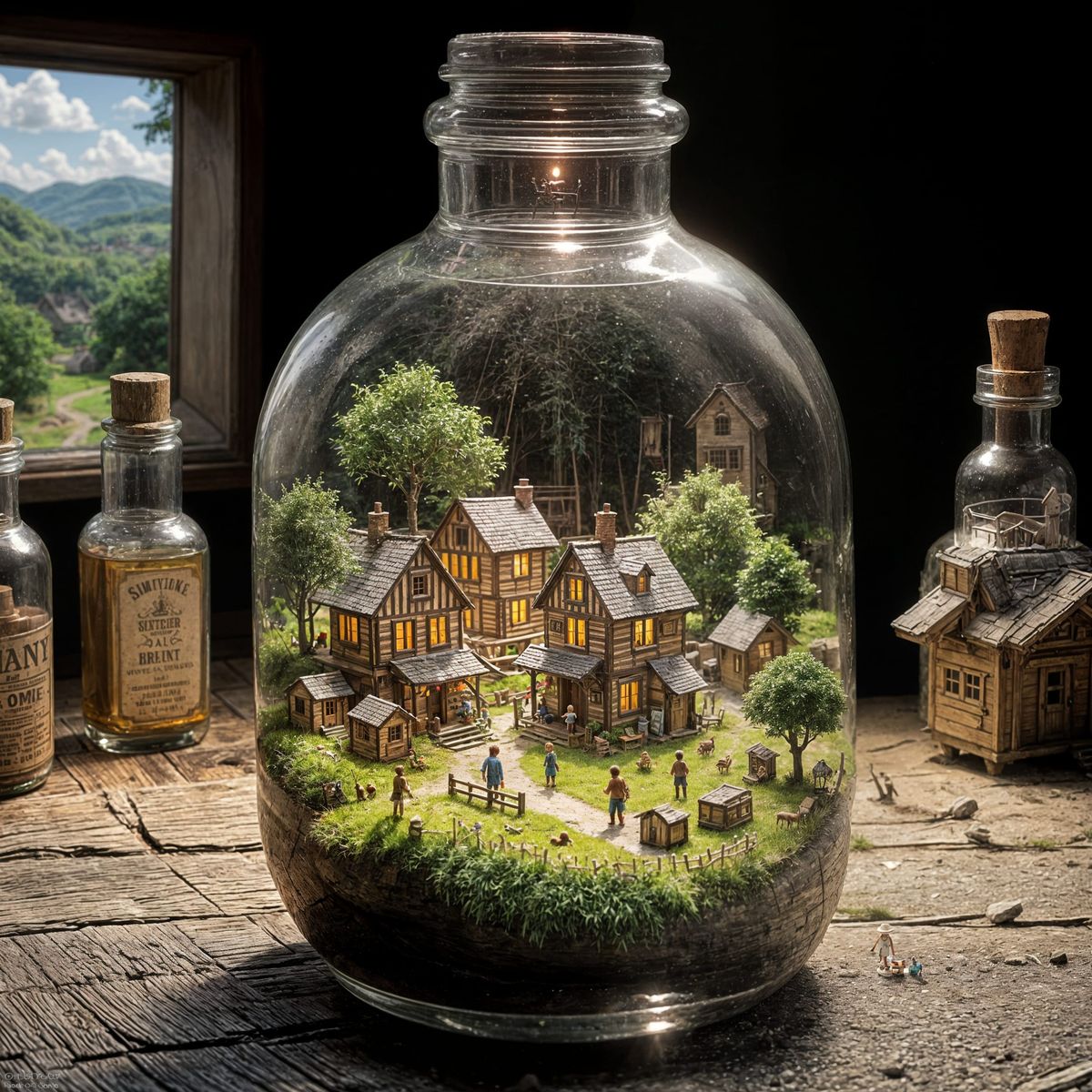 A wide shot photograph showing a miniature village with tiny figures contained within a glass bottle. The image features dramatic, cinematic lighting and realistic details.
