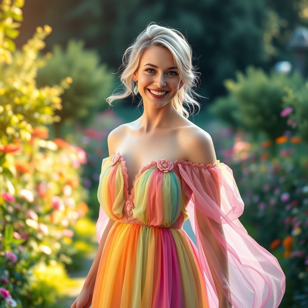 This vibrant portrait shows a stylish European woman with blonde hair and a bright smile, walking down a serene garden path lined with lush greenery and vibrant flowers. Her elegant gown shimmers in soft pastel hues, and her delicate features are accentuated by warm, soft light. Inspired by the Art Nouve...