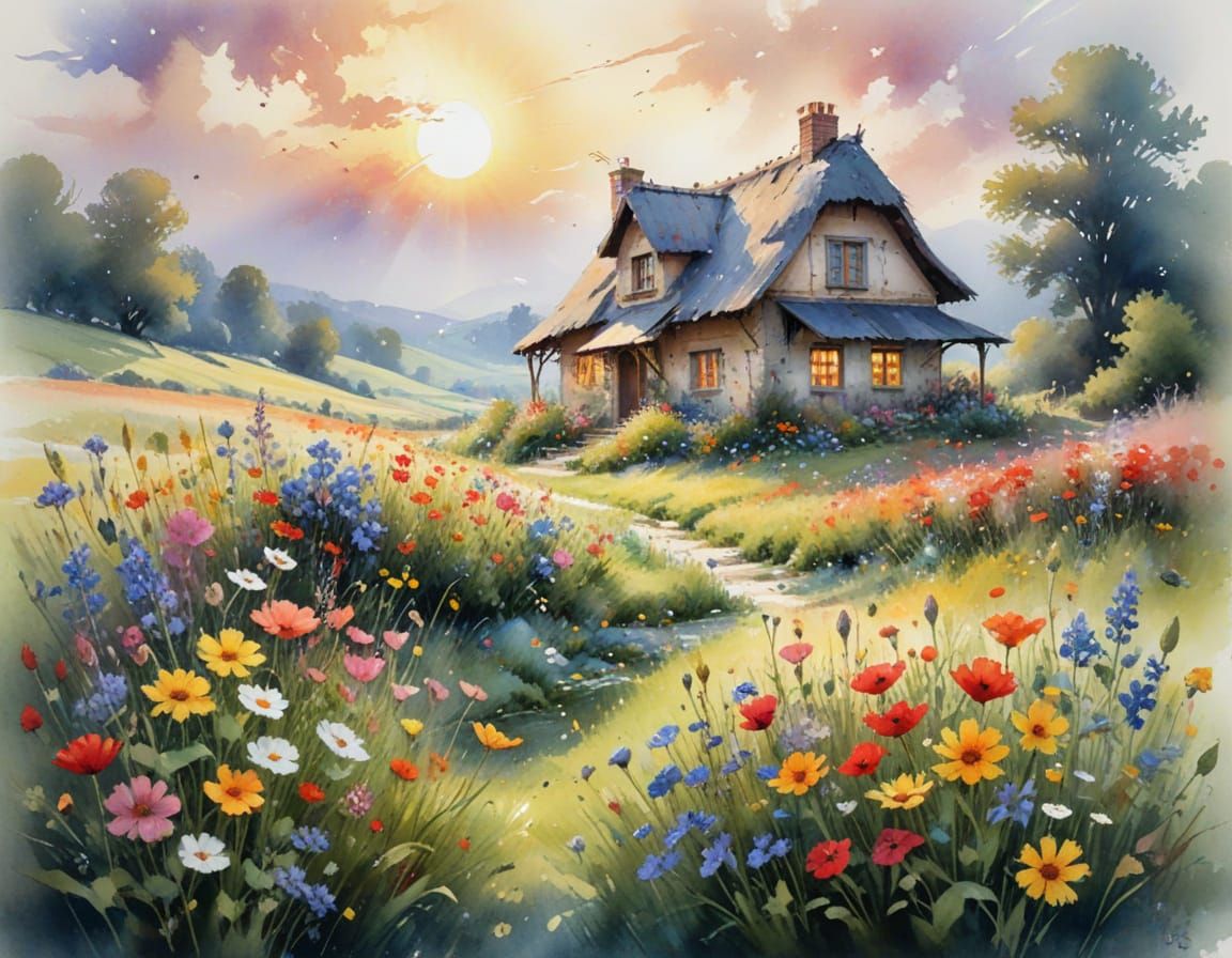 A vibrant watercolor painting of a sunlit meadow filled with wildflowers and a quaint cottage. The artwork captures a blend of styles, using delicate watercolor techniques to create a mesmerizing fusion of nature and serenity.