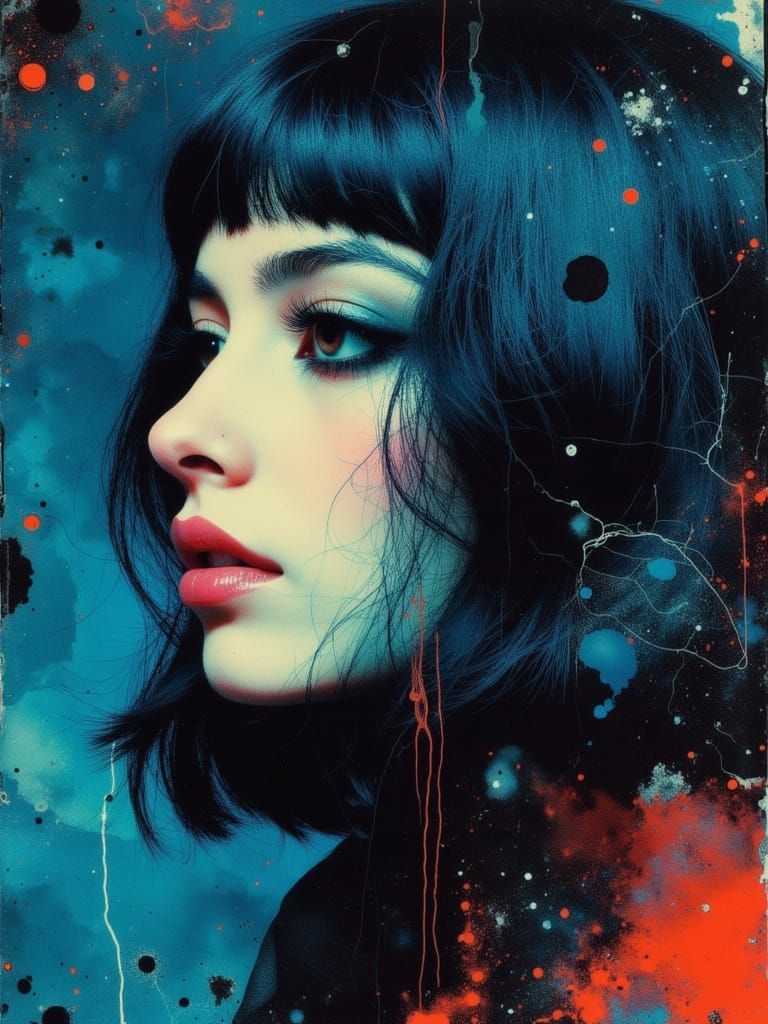 This image shows a beautiful melancholic woman with blue hair in a gothic portrait. It features a neon grunge aesthetic with surreal and abstract elements, rendered with alcohol inks.