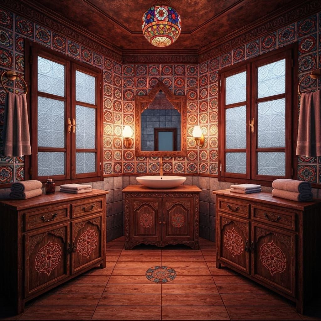 This image showcases a realistic 3D rendering of a Turkish-style bathroom. It features traditional wooden furniture and vibrant motifs, with bright, high-contrast lighting creating a moody atmosphere.