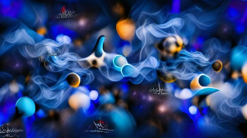 This image shows an abstract space scene featuring volumetric shapes floating in a blue-lit, smoky atmosphere. The artwork has a professional photography aesthetic with bokeh and natural lighting.