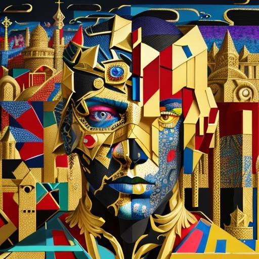 A maximalist image with surrealist elements. It features gold, black, pink, red, and blue colors in a baroque style. The image showcases detailed and photorealistic face features.