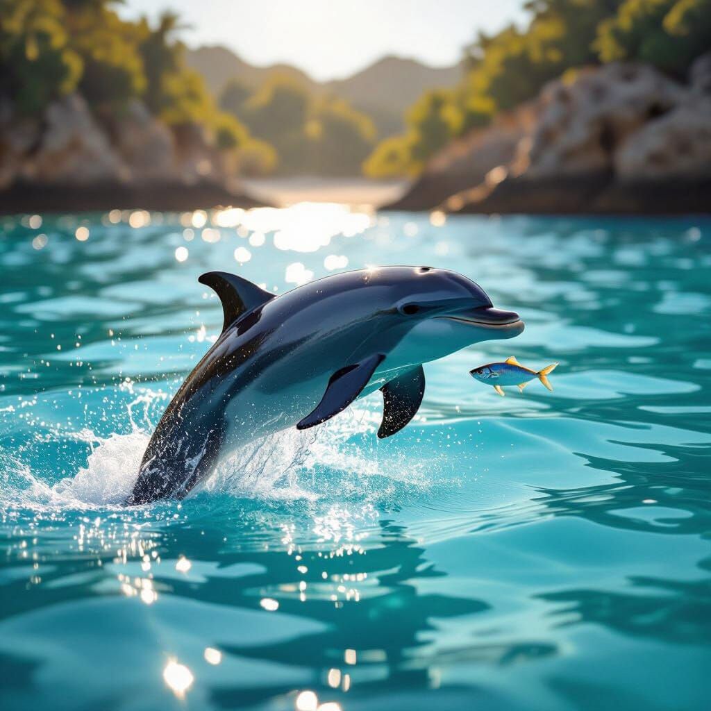 This image shows a dolphin leaping from vibrant turquoise water, catching a small fish. Sunlight creates a shimmering effect on the surface, captured in a realistic, high-detail style with a cinematic palette.