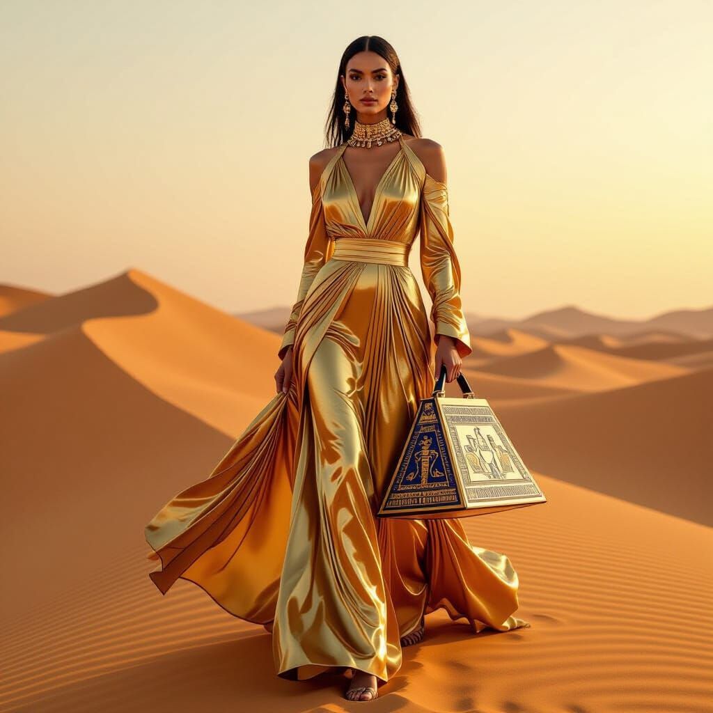 This image shows a model in a gold gown walking on a desert runway. The model is carrying a pyramid-shaped bag, and the image is lit with orange backlighting in a high fashion editorial style.