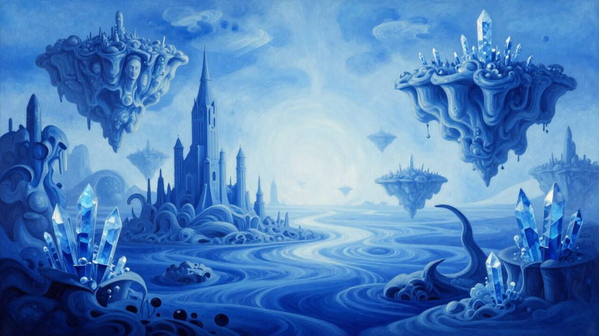 This image presents a surreal, dreamlike landscape in a monochromatic blue palette. It features swirling forms, gravity-defying structures, and floating islands with crystalline details, rendered in a matte painting style.