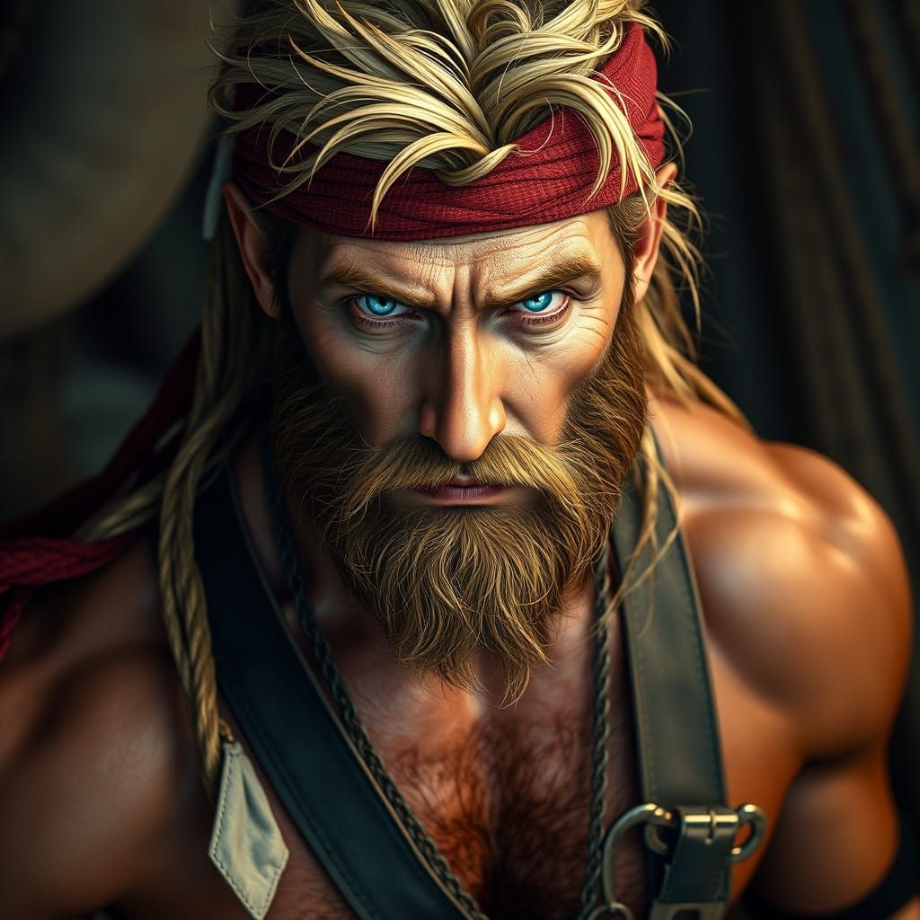 A head and shoulders portrait of a handsome, blonde-bearded pirate with intense blue eyes. The image is rendered in high resolution with dynamic lighting, in a fantasy realism digital painting style.