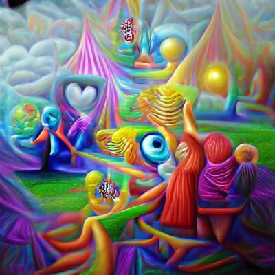 A vibrant surrealist painting of intertwined spirits. The image is rendered in a colorful, detailed style reminiscent of oil on canvas, with psychedelic elements.