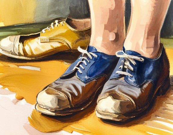 A vibrant image of vintage shoes rendered in a gouache and watercolor style. The artwork features thick brush strokes and textures, reminiscent of impressionist masterpieces.