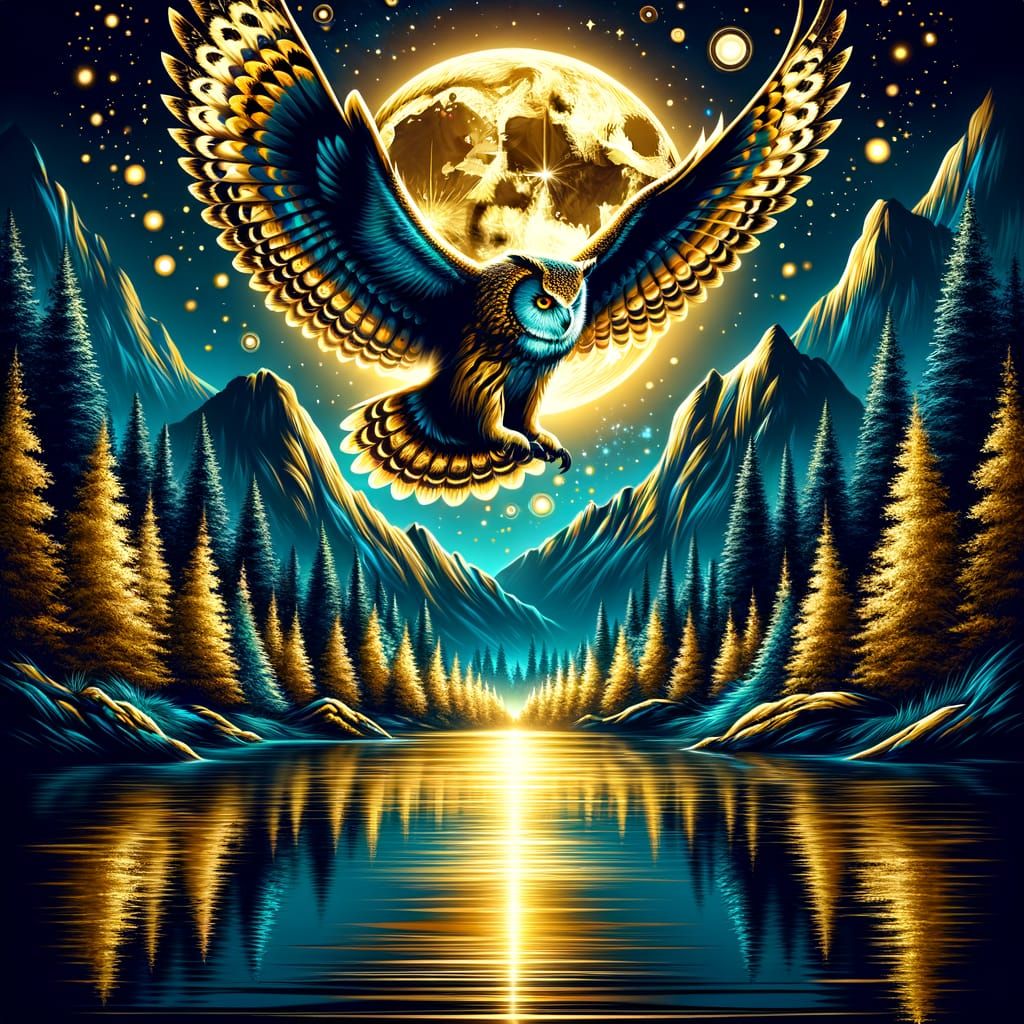 This image shows a majestic owl in flight above a still lake, reflecting the light of a full moon. Forested mountains surround the lake, and the scene is lit with fantastical lights in deep blues and golds.