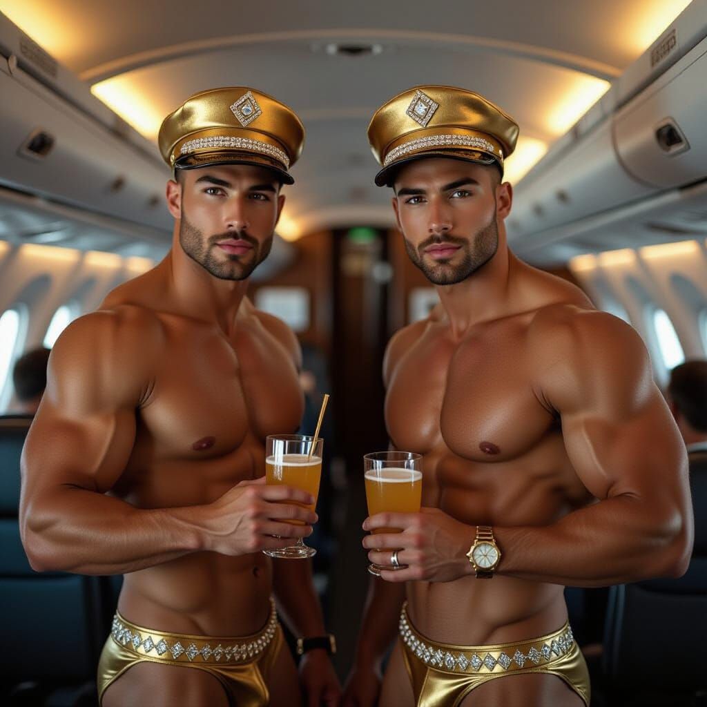 This image shows two muscular men serving drinks on a chartered flight. The men are wearing golden leather thongs and caps with diamond patterns. The image is photorealistic with vibrant colors.