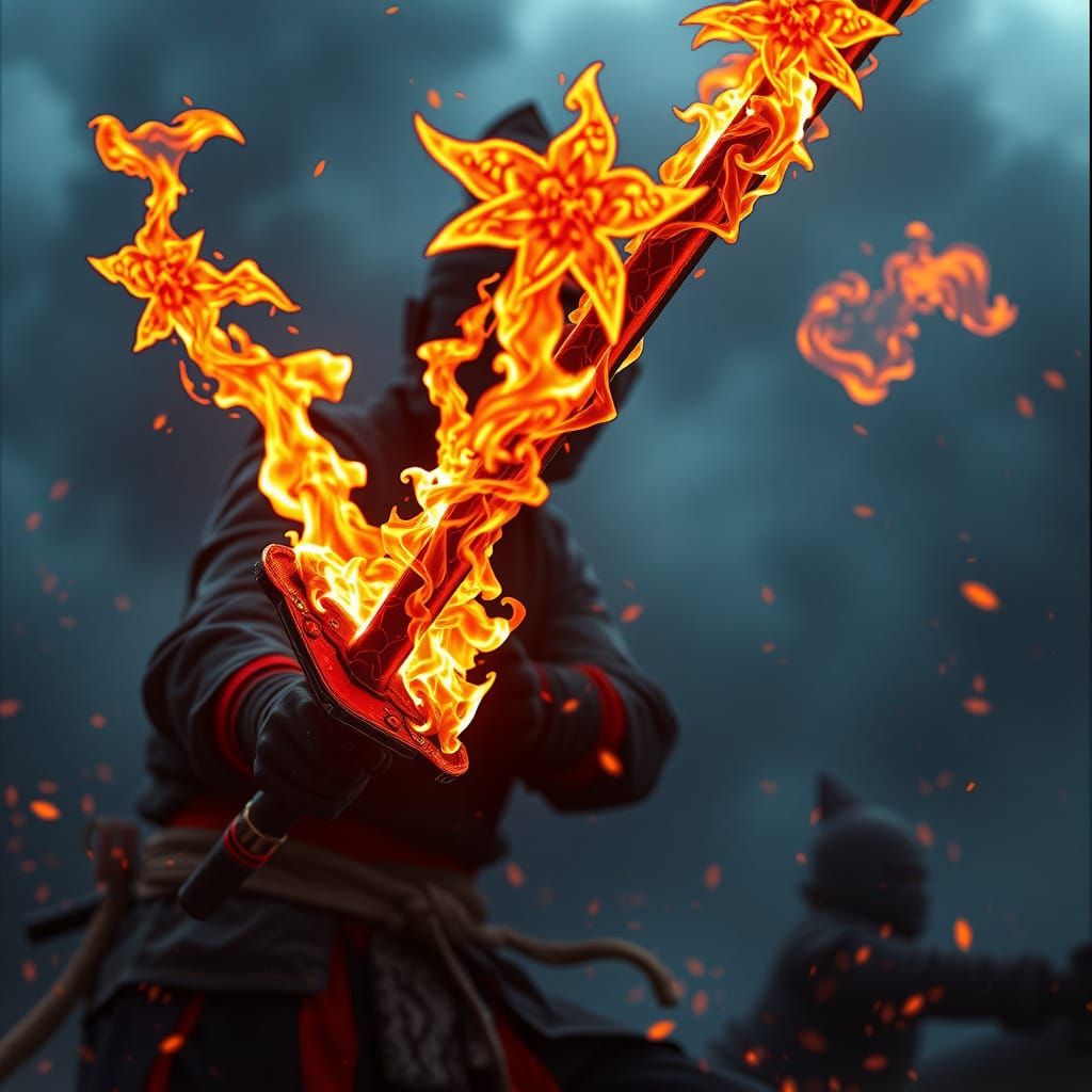 This image showcases a stunning, detailed depiction of a fire katana, rendered in 8k resolution with a deep color palette and intricate details, evoking a sense of fantasy and cinematic grandeur.