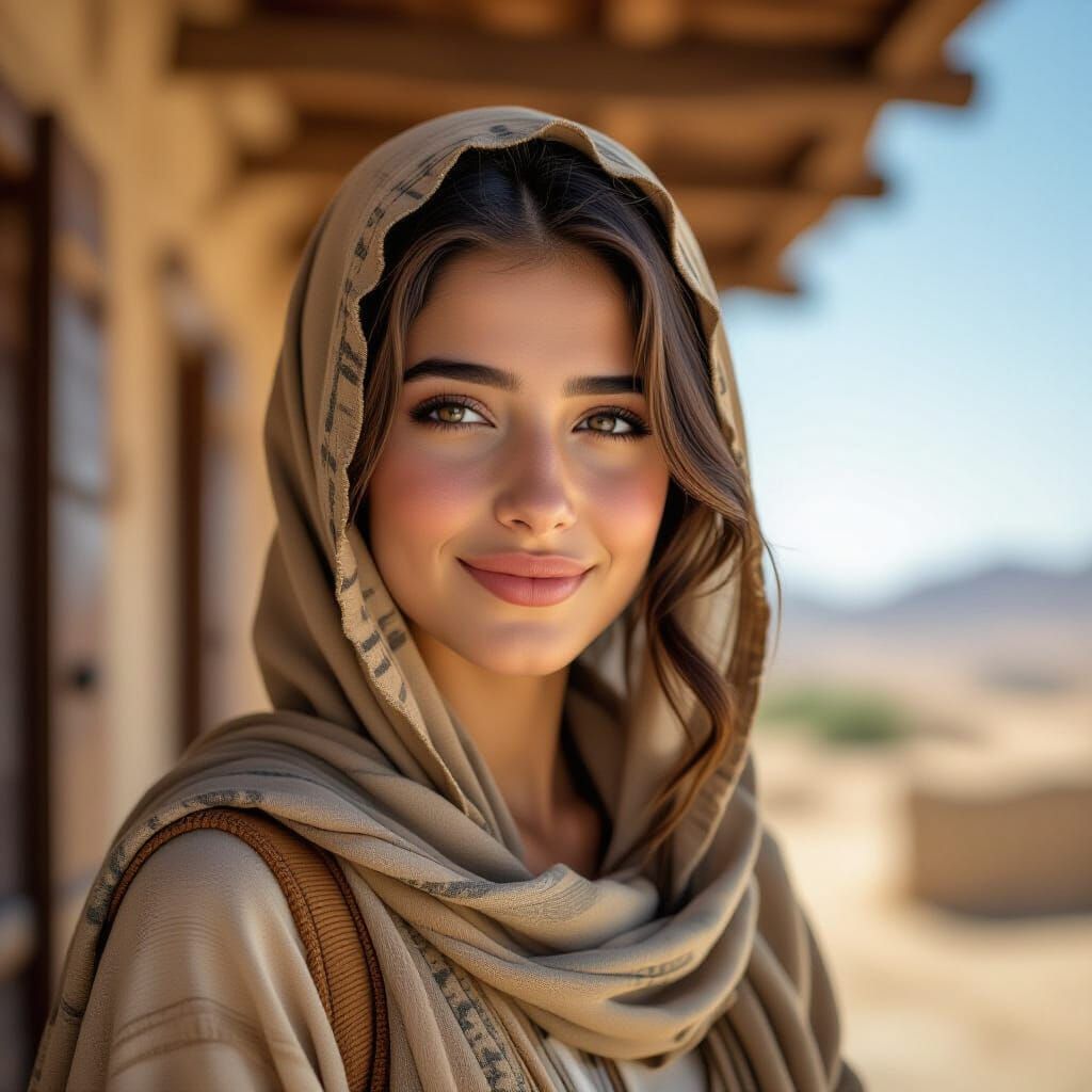 This image shows a photorealistic portrait of a 20-year-old Hebrew woman in traditional clothing from 2270 BCE. The portrait captures intricate details and textures under a clear sky, rendered with hyperrealism.