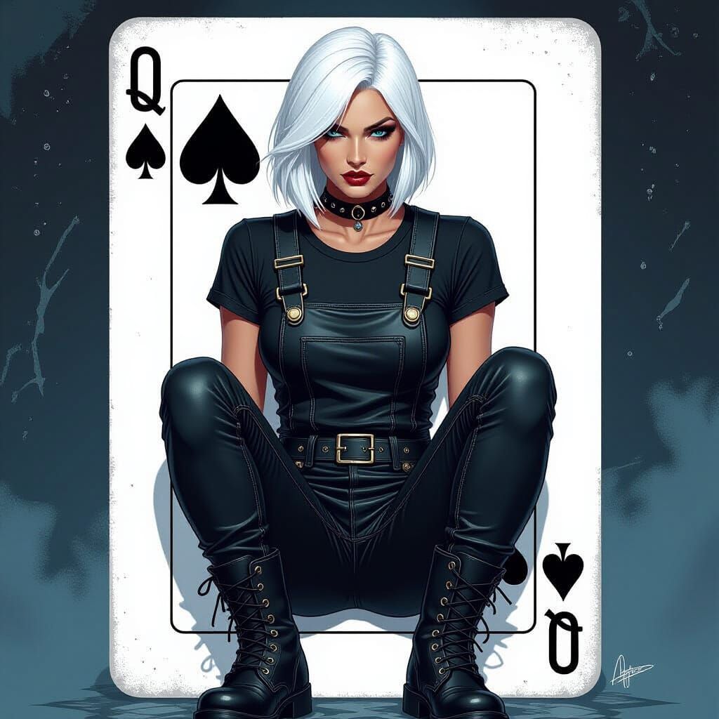 A detailed portrait of a dark elf woman with a white bob, featured on a Queen of Spades card. The art uses dynamic lighting and triadic colors for a striking effect.