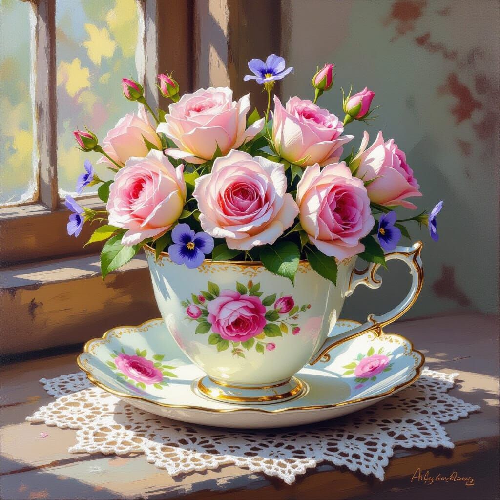 A still life of a teacup brimming with roses and violets. The image showcases thick, textured impasto oil paint, reminiscent of cottagecore style with impressionist realism and buttery layers.