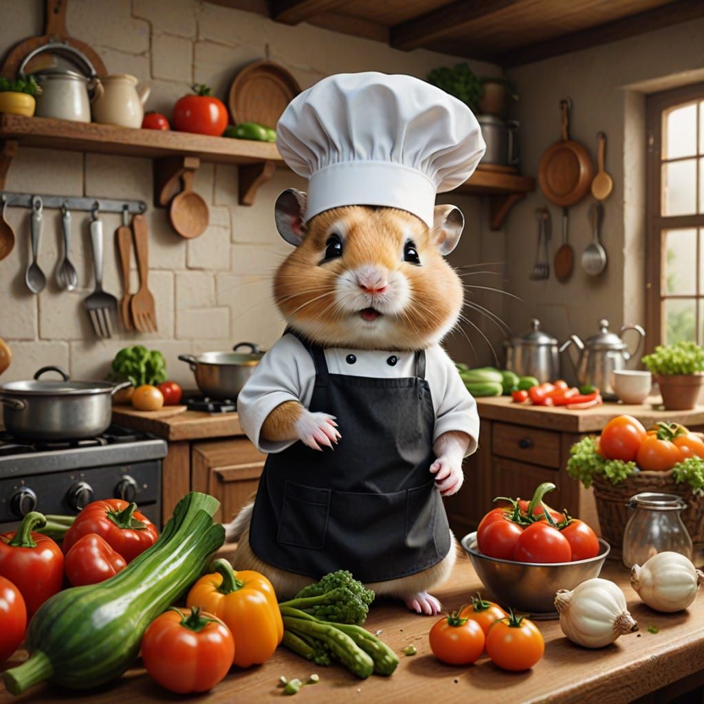 This charming illustration features a cute hamster chef in a chef hat, preparing vegetables in a detailed, rustic kitchen. Rendered in a whimsical, vibrant style with warm lighting.