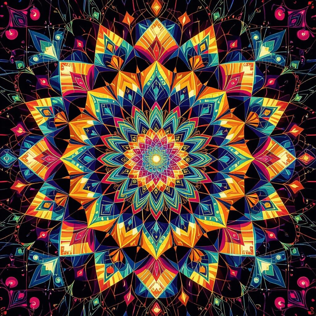 A vibrant image showing a geometric mandala radiating from a center point. The kaleidoscopic patterns and bold colors create mesmerizing light effects in a psychedelic art style.