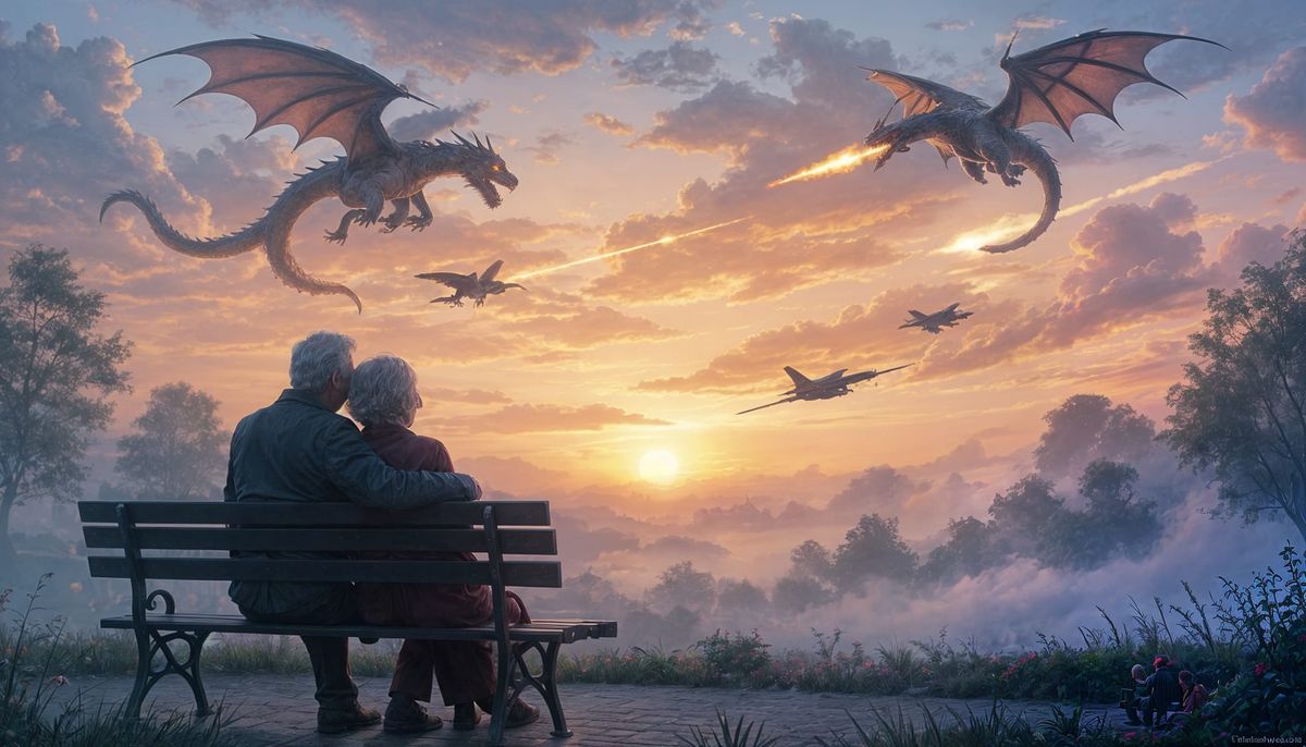 This image shows an elderly couple embracing on a park bench against a vibrant sunset. In the distance, dragons battle fighter jets, creating a fantasy scene with ethereal mist.