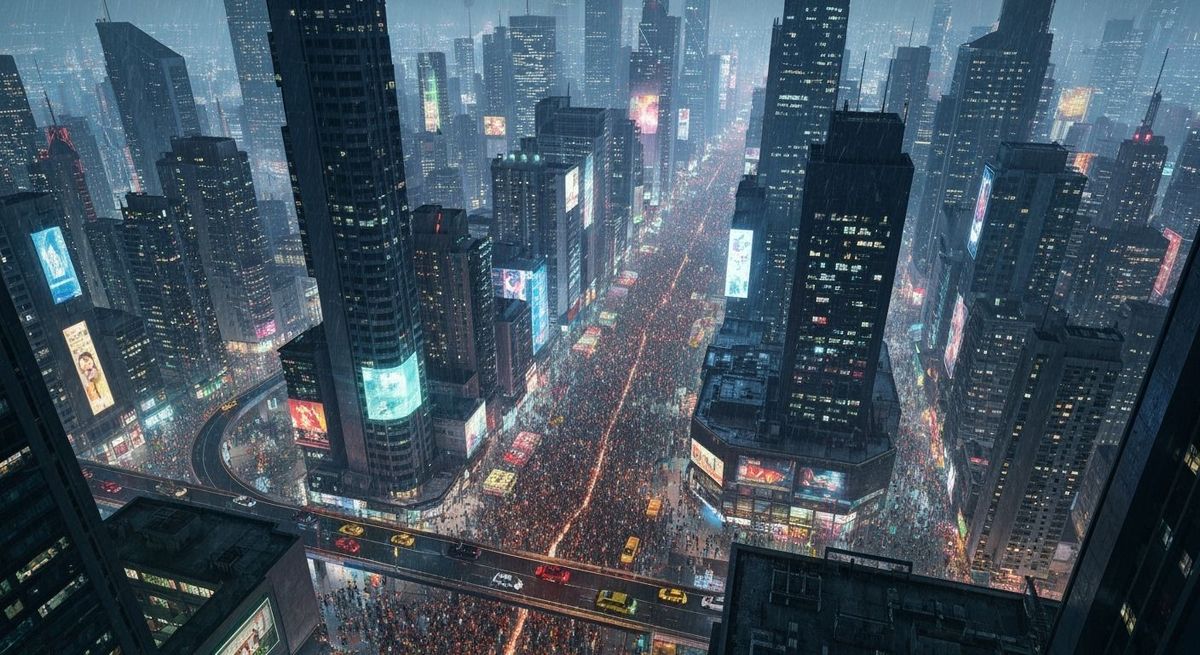 This image showcases a vast, high-tech cyberpunk metropolis at night. Towering skyscrapers with holographic ads dominate the view, with dense, illuminated streets below.