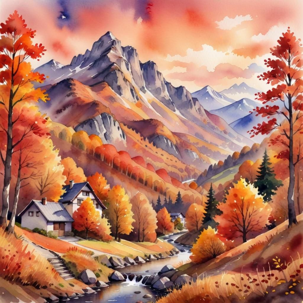 A vibrant watercolor painting of an autumn mountain landscape. The artwork blends romantic and artistic styles to capture the beauty and tranquility of the natural scene.