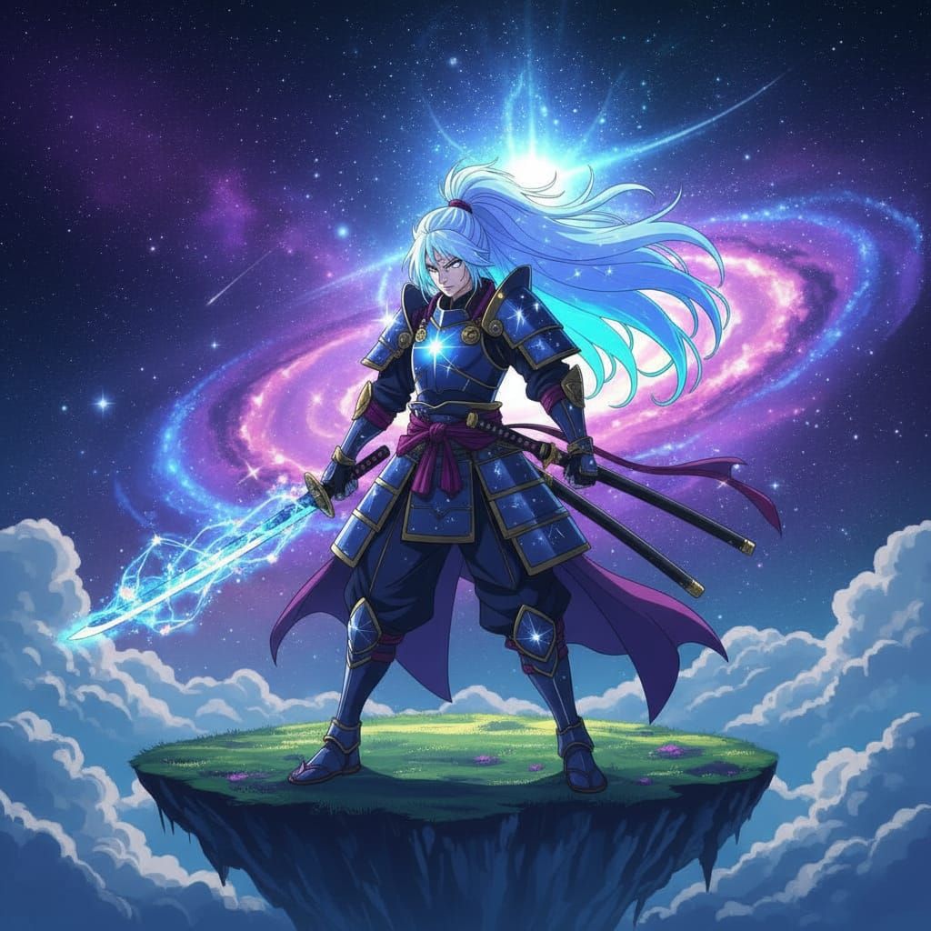 This image shows a nebula-armored samurai warrior with starlight hair on a floating island surrounded by a galaxy. The radiant anime artwork features bold lines and cinematic lighting.