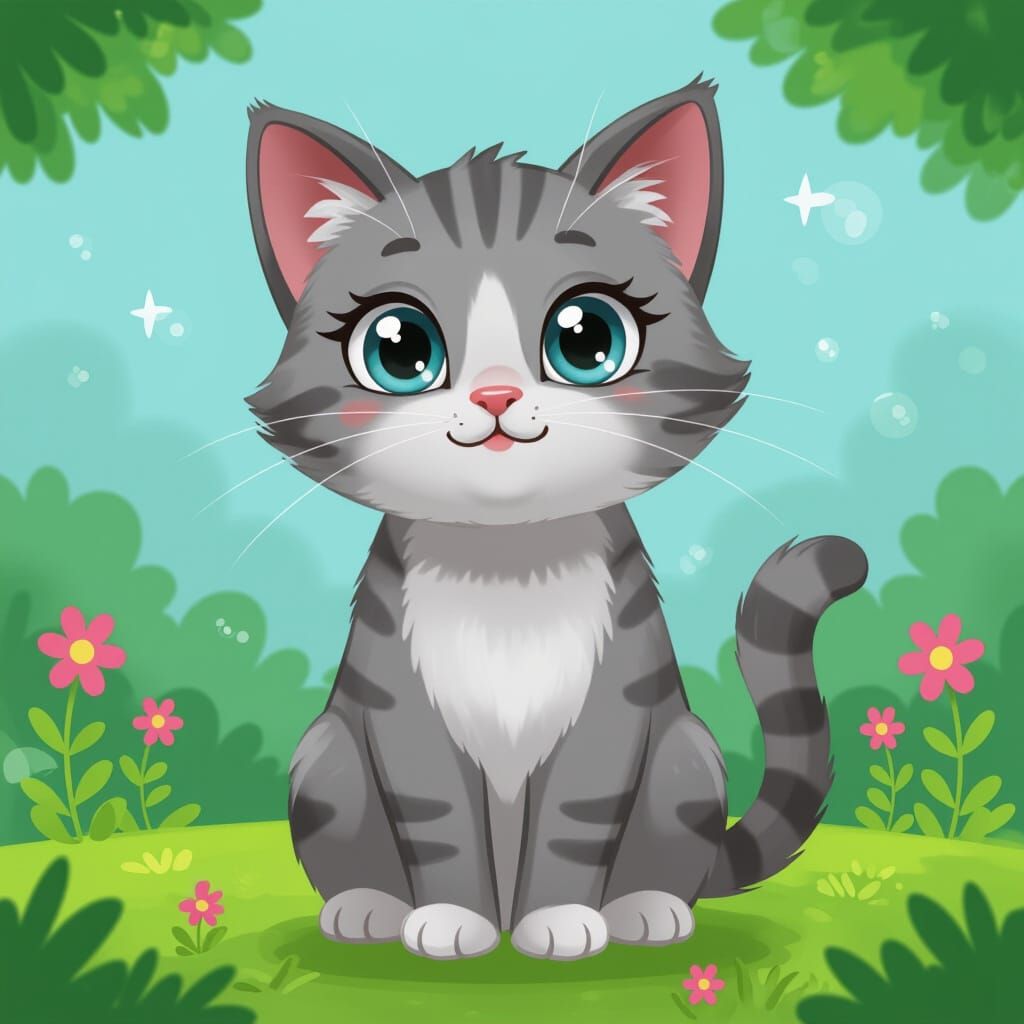 A charming image of a cartoon cat. The artwork features bright colors and simple shapes, creating an appealing and playful aesthetic suitable for children.
