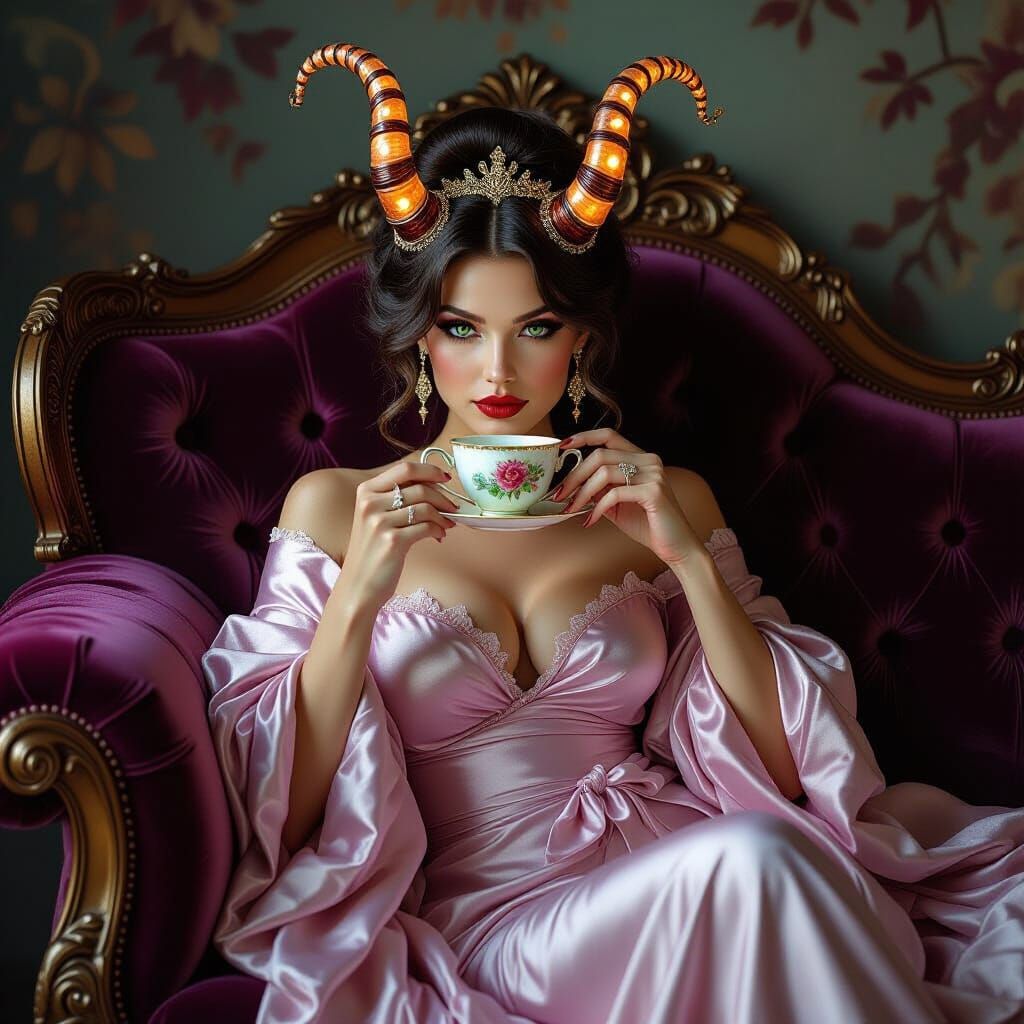 A striking picture of Queen Chrysalis relaxing on a chaise lounge. The image features intricate textures and soft lighting, reminiscent of Renaissance art with a modern, whimsical twist. Digital painting style.