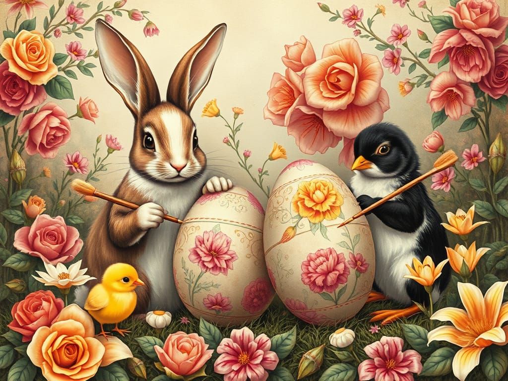 A whimsical drawing shows two bunnies and two chicks painting Easter eggs decorated with flowers in a fairy tale landscape. The artwork features elements of Art Nouveau and dreamlike textures.