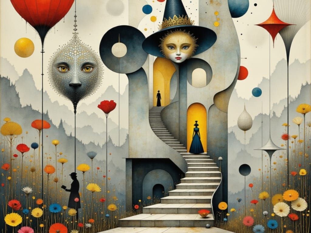 This image shows a fantastical, dreamlike scene of a masked Alice on a grand staircase, surrounded by the Queen of Hearts, poppy flowers, and the Mad Hatter, all blended in a surreal, abstract landscape reminiscent of M.C. Escher's paradoxical constructions and Gustav Klimt's art nouveau style.