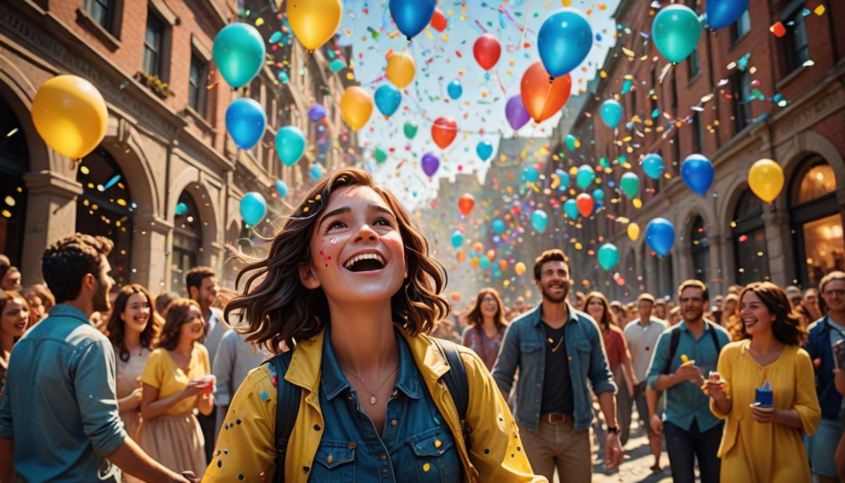 This colorful digital artwork depicts a lively city square scene, showcasing people in playful costumes engaging in lighthearted pranks, set against a backdrop of radiant, gradient colors and stylized 3D textures reminiscent of Disney's fantasy worlds.