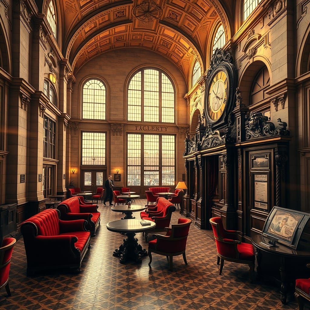 This image shows a grand, high-ceilinged train station interior, with ornate windows and intricate, geometric-patterned tiles, set in a warm, golden light. Plush sofas and elegant tables are arranged around a majestic, brass-accented clock, with a beautifully crafted antique ticket window nearby.