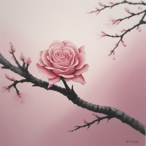 This image shows a woman in a pink dress, rendered in a Japanese ink wash style. Soft brushstrokes and pastel colors create a delicate, minimalist, and elegant aesthetic in a soft focus.
