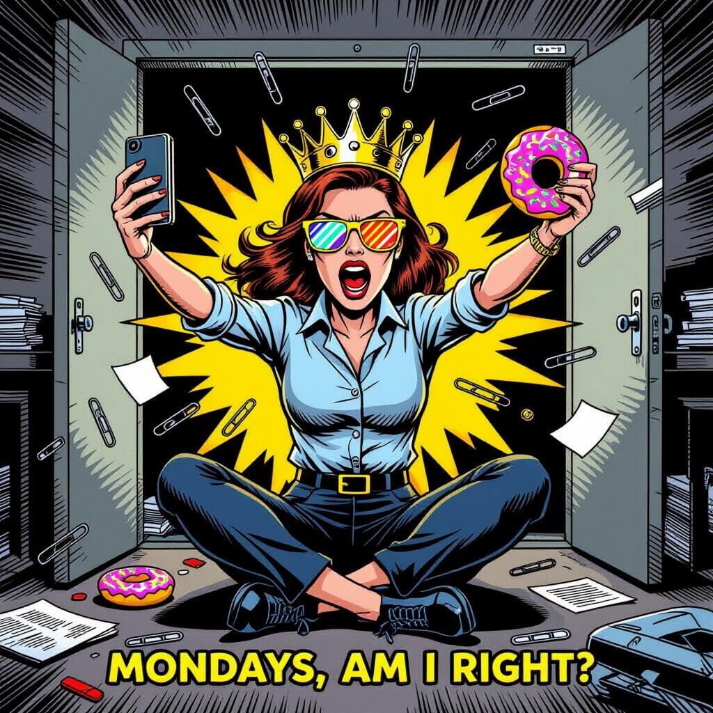This image shows a secretary taking a bold selfie inside a stationery cupboard, wearing a paperclip crown and post-it note sunglasses, with a chaotic office scene behind her, in a dynamic comic book style.