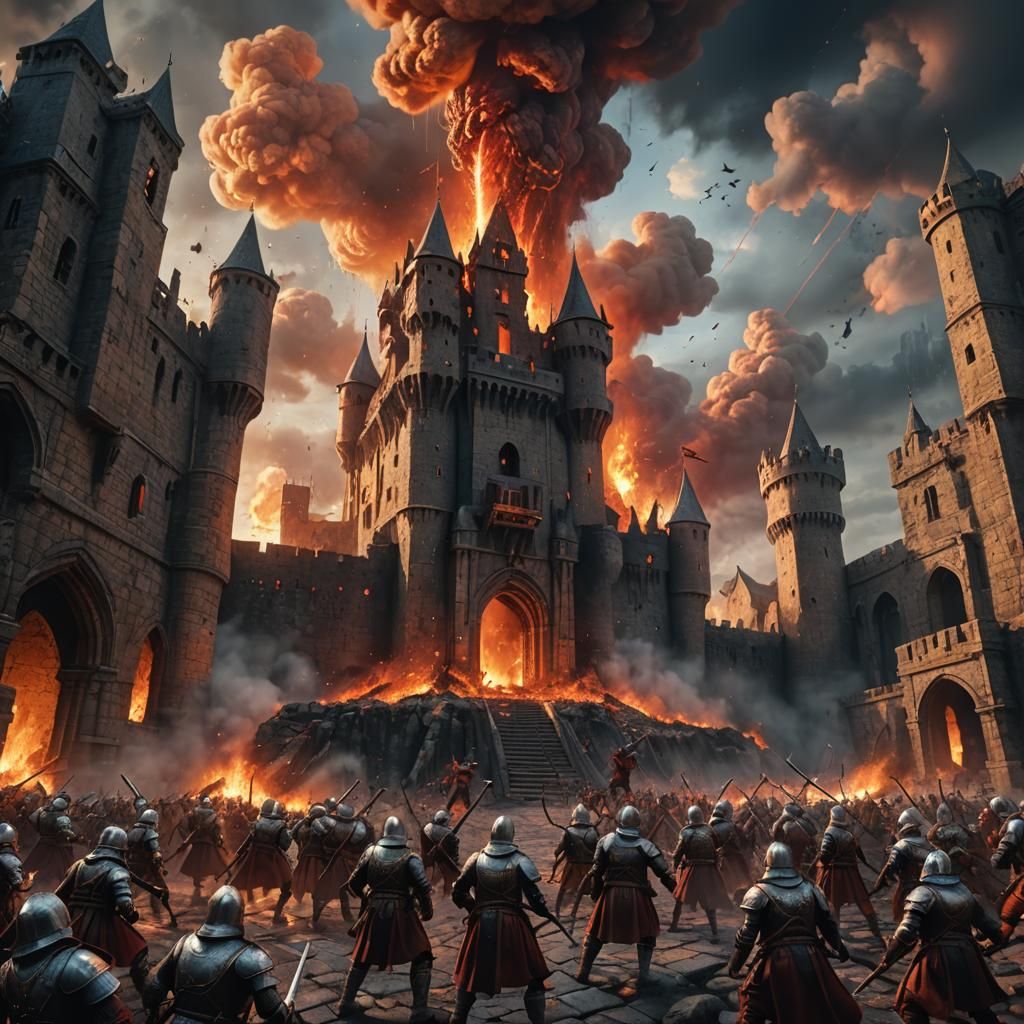 A dynamic scene of medieval soldiers battling in an old castle. Molten lava cascades down the castle walls under epic clouds, rendered with highly realistic textures and vibrant colors, in a fantasy matte painting style.