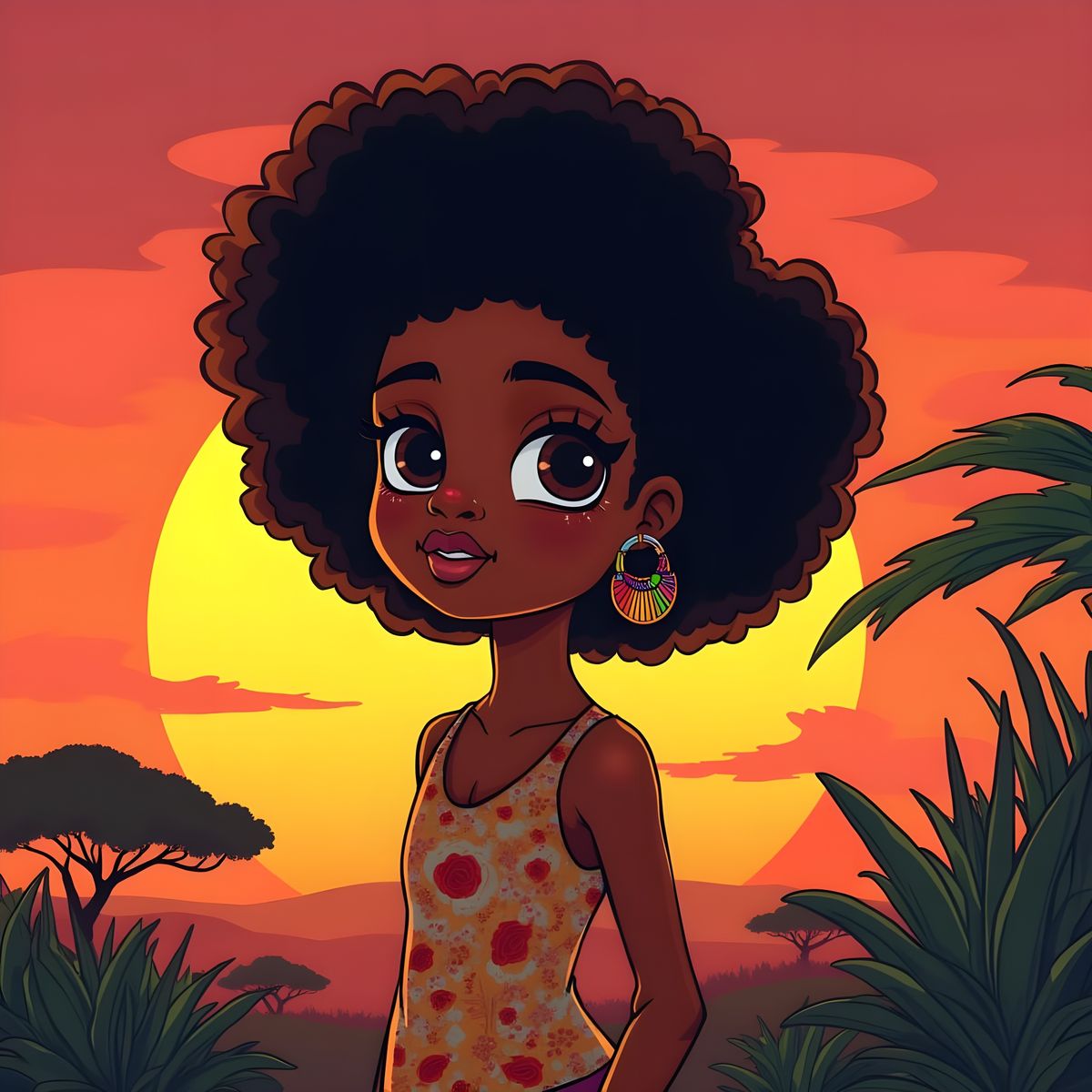 This image shows a young girl with an Afro and hooped earring set against the vibrant colors of an African sunset, created in a playful cartoon style