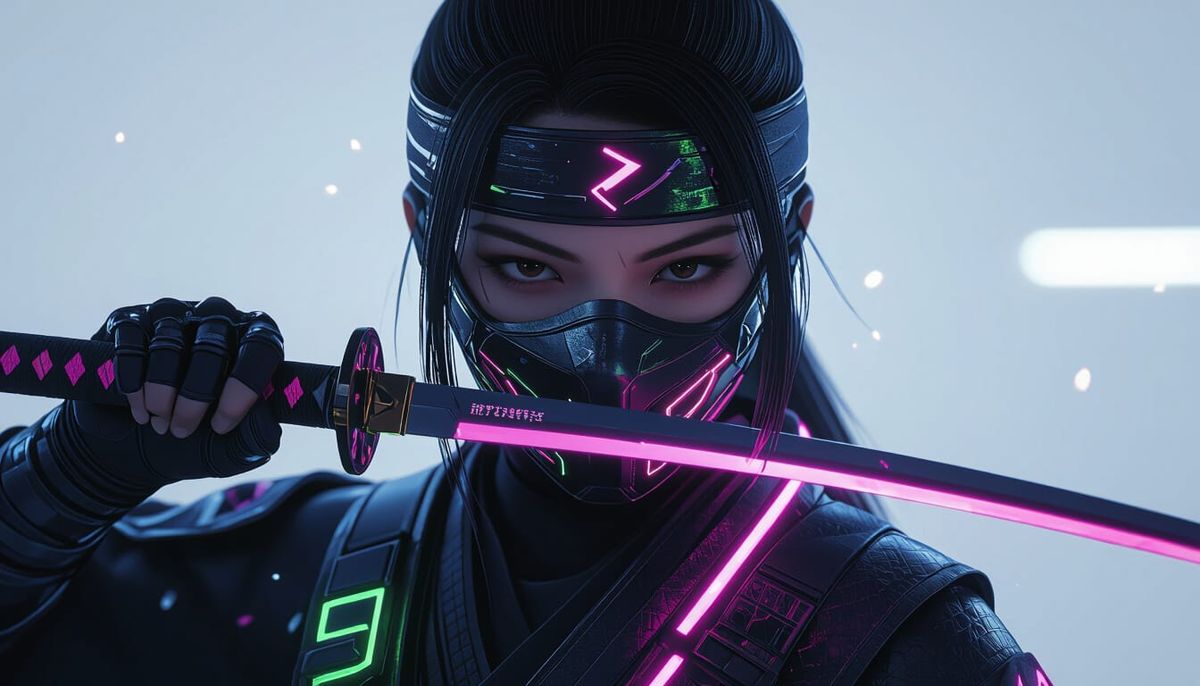 A hyper-realistic image of a futuristic ninja. The figure, clad in black with neon accents, is holding a katana. Deep blues, purples, pink, and green create an atmospheric, detailed scene.