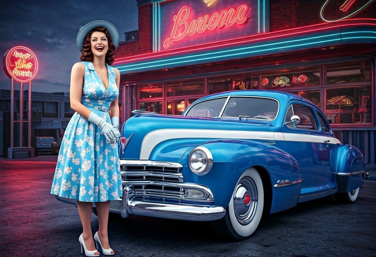 "old vintage advertising illustration, A confident and beautiful pinup woman in light blue dress, outdoors next to blue white and chrome 1940s car in front of diner restaurant, laughing detailed matte painting, deep color, fantastical, intricate detail, splash screen, complementary colors, fantasy concept art, 8k resolution trending on Artstation Unreal Engine 5"