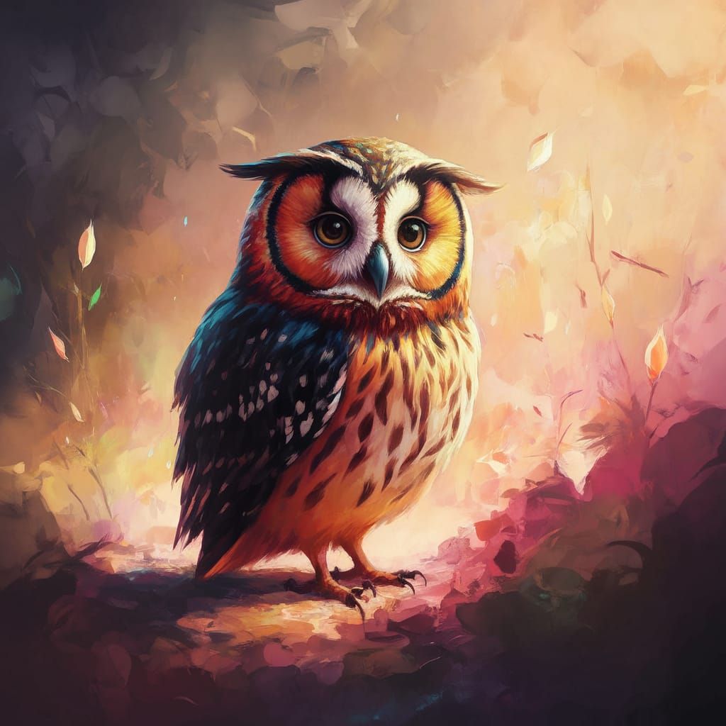 This enchanting image shows a cute owl standing out in a surreal dreamscape, painted in a wet, textured style with visible brushstrokes. Warm, ethereal lighting highlights the fine details of the owl's feathers and surroundings, creating a captivating and dreamy atmosphere.