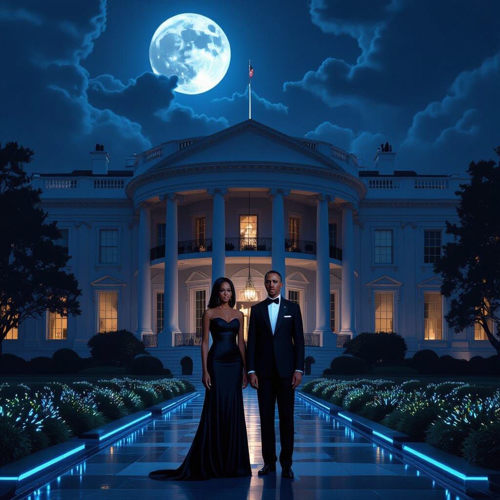 A striking image of an obsidian-black White House in art deco style, with President and Michelle Obama in the foreground under dramatic moonlight and blue accents.