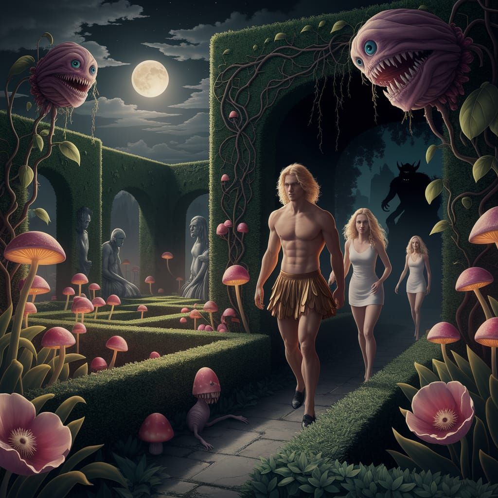 This image shows a surreal garden at night filled with luminous flora. Strange vines and glowing mushrooms line the paths, where a man and woman navigate a hedge maze, threatened by lurking monsters. Golden light bathes the haunting scene.
