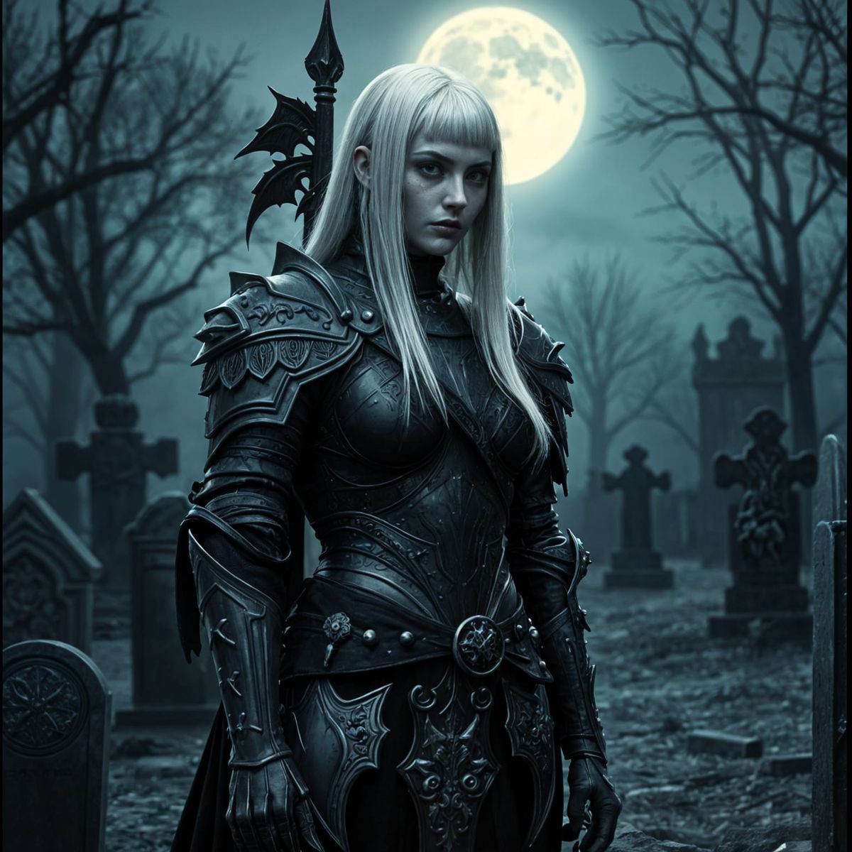 This image shows a gothic female knight in ornate armor guarding a graveyard under moonlight. The cinematic rendering evokes classic horror films through dramatic lighting and film grain.