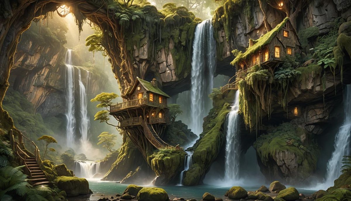 A whimsical treehouse nestled within a cave, concealed behind a cascading waterfall. The ethereal scene features soft brushstrokes, glittering sparks, and warm, golden light in a vibrant, pastel palette.