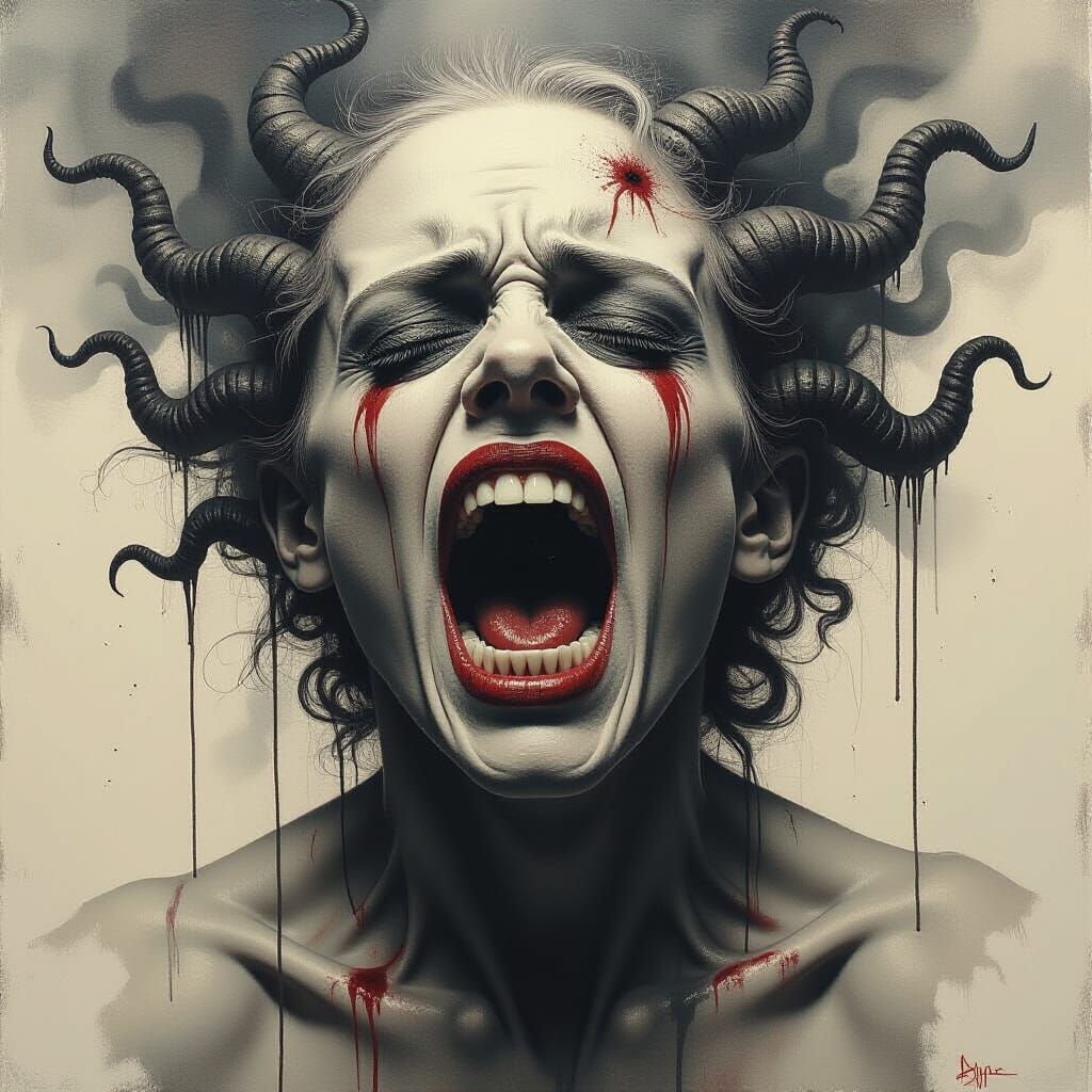 This image shows a nightmarish, gaping mouth twisted in a scream. The scene evokes cosmic horror through unsettling textures and muted colors, reminiscent of dark surrealist art.