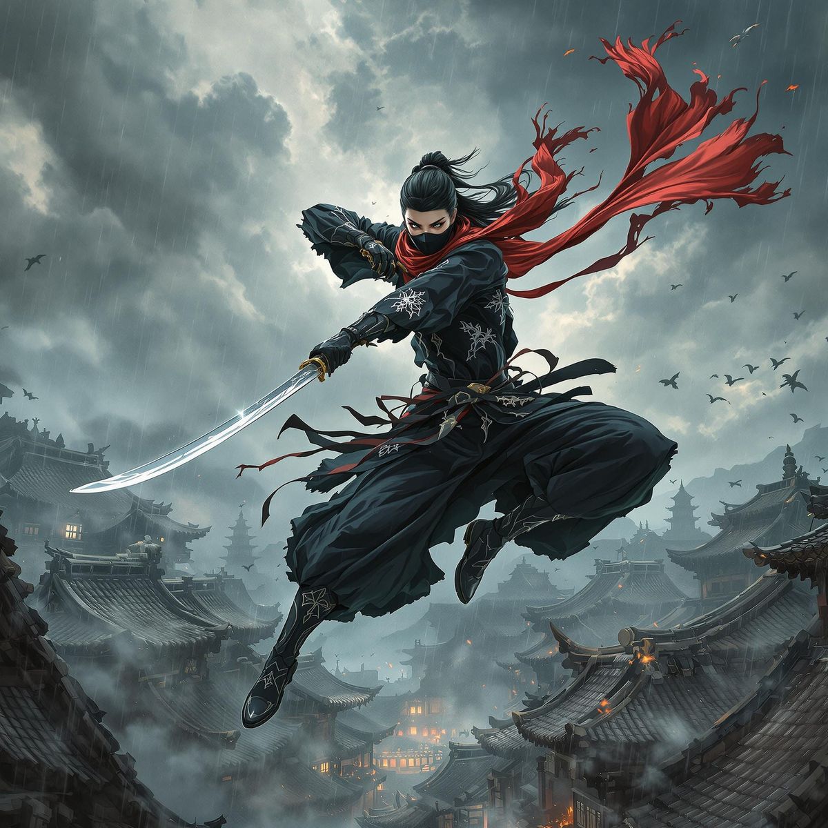 A striking picture of a female ninja warrior leaping across rooftops during a storm. She wears traditional garb, and her crimson scarf flows dramatically behind her, all rendered with ultra-realistic textures and dynamic lighting.