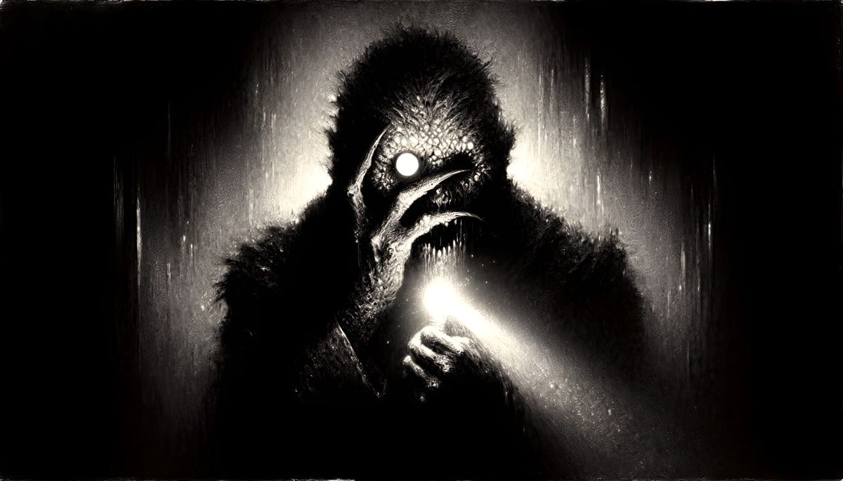 'A horrific beast creature hiding in a dark alleyway covers its face as a single beam of torchlight reflects off of one of its large black eye'. Dense charcoal, with strong greyscale, pearl white and carbon black. Chiaroscuro, unnerving horror, macabre and sinister. Finished art, masterpiece.